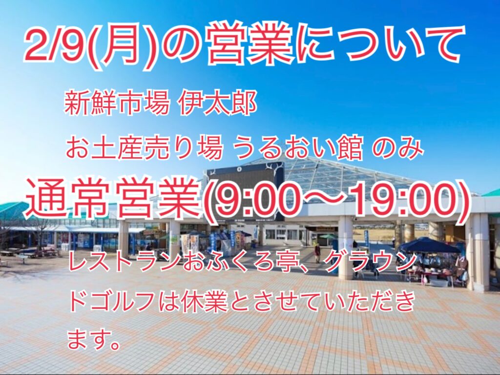 2/9(月)の営業について 2026年2月8日 新着情報 admceitc いつも道の駅いたこをご利用いただき誠にありがとうございます。 明日2/9(月)は・新鮮市場 伊太郎→通常営業(9:00~19:00)・お土産売り場 うるおい館→通常営業(9:00~19:00)・レストラン おふくろ亭→休業・グラウンドゴルフ→休業とさせていただきます。お客様には大変ご迷惑をおかけいたしますが、ご理解のほどよろしくお願い申し上げます。路面凍結の恐れがあるためご来店の際にはお気をつけてお越しくださいませ🙇