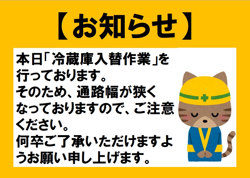 冷蔵庫入替に伴う通路幅減少のお知らせ